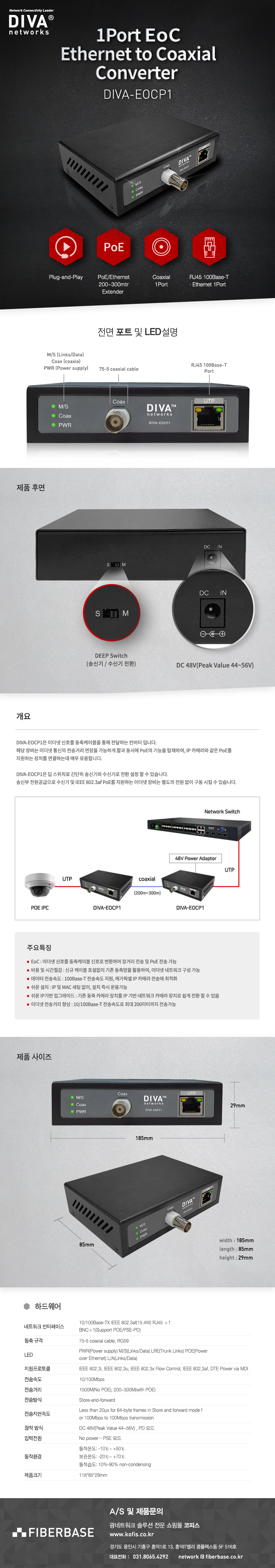 ![]() Introduction¡Ü DIVA-EOCP1Àº ÀÌ´õ³Ý ½ÅÈ£¸¦ µ¿ÃàÄÉÀ̺íÀ» ÅëÇØ Àü´ÞÇÏ´Â ÄÁ¹öÅÍ ÀÔ´Ï´Ù.ÇØ´ç Àåºñ´Â ÀÌ´õ³Ý Åë½ÅÀÇ Àü¼Û°Å¸® ¿¬ÀåÀ» °¡´ÉÇÏ°Ô ÇÔ°ú µ¿½Ã¿¡ PoEÀÇ ±â´ÉÀ» žÀçÇÏ¿©, IP Ä«¸Þ¶ó¿Í °°Àº PoE¸¦ Áö¿øÇÏ´Â ÀåÄ¡¸¦ ¿¬°áÇϴµ¥ ¸Å¿ì À¯¿ëÇÕ´Ï´Ù. ¡Ü DIVA-EOCP1Àº µö ½ºÀ§Ä¡·Î °£´ÜÈ÷ ¼Û½Å±â¿Í ¼ö½Å±â·Î Àüȯ ¼³Á¤ ÇÒ ¼ö ÀÖ½À´Ï´Ù. ¼Û½ÅºÎ Àü¿ø°ø±ÞÀ¸·Î ¼ö½Å±â ¹× IEEE 802.3af PoE¸¦ Áö¿øÇÏ´Â ÀÌ´õ³Ý Àåºñ´Â º°µµÀÇ Àü¿ø ¾øÀÌ ±¸µ¿ ½Ãų ¼ö ÀÖ½À´Ï´Ù. ÁÖ¿äÆ¯Â¡¡Ü Plug-and-Play¡Ü PoE / Ethernet 200 ~ 300 mtr Extender ¡Ü RJ45 100Base-T ÀÌ´õ³Ý 1Æ÷Æ® ¡Ü Coaxial 1Æ÷Æ® ÇÏµå ¿þ¾î