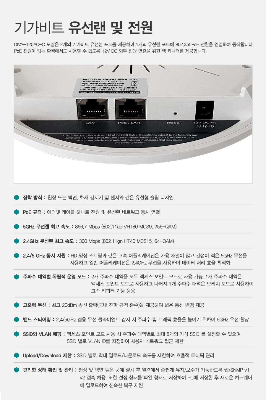 WEP(64/128bits), WPA2 PSK, WPA/WPA2 PSK Mixed, IEEE 802.1X authentication SSID broadcast control, VLAN, Client isolation |