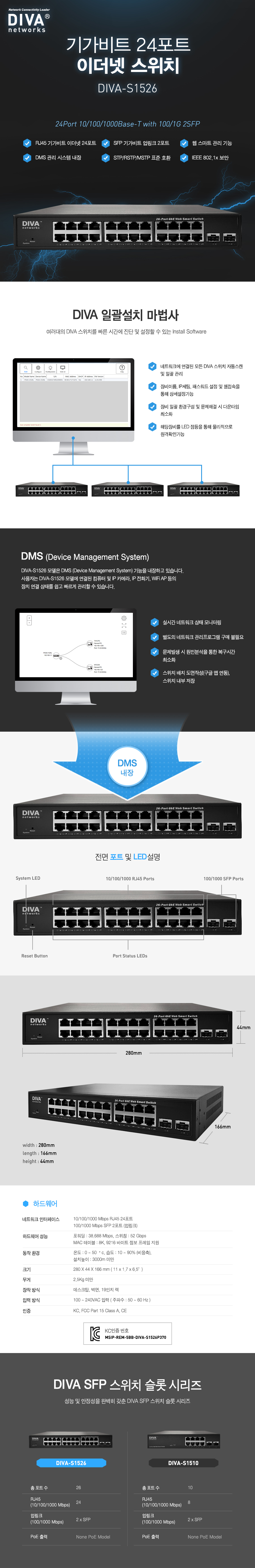![]() Introduction¡Ü DIVA-S1526 ¸ðµ¨Àº DMS (Device Management System) ±â´ÉÀ» ³»ÀåÇϰí ÀÖ½À´Ï´Ù. »ç¿ëÀÚ´Â DIVA-S1526 ¸ðµ¨¿¡ ¿¬°áµÈ ÄÄÇ»ÅÍ ¹× IP Ä«¸Þ¶ó, IP Àüȱâ, WiFi AP µîÀÇ ÀåÄ¡ ¿¬°á »óŸ¦ ½±°í ºü¸£°Ô °ü¸®ÇÒ ¼ö ÀÖ½À´Ï´Ù.ÁÖ¿äÆ¯Â¡¡Ü RJ45 ±â°¡ºñÆ® ÀÌ´õ³Ý 24Æ÷Æ®¡Ü SFP ±â°¡ºñÆ® ¾÷¸µÅ© 2Æ÷Æ® ¡Ü À¥ ½º¸¶Æ® °ü¸® ±â´É ¡Ü DMS °ü¸® ½Ã½ºÅÛ ³»Àå ¡Ü STP/RSTP/MSTP Ç¥ÁØ È£È¯ ¡Ü IEEE 802.1x º¸¾È ÇÏµå ¿þ¾î
